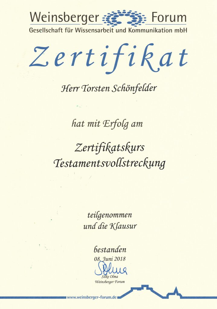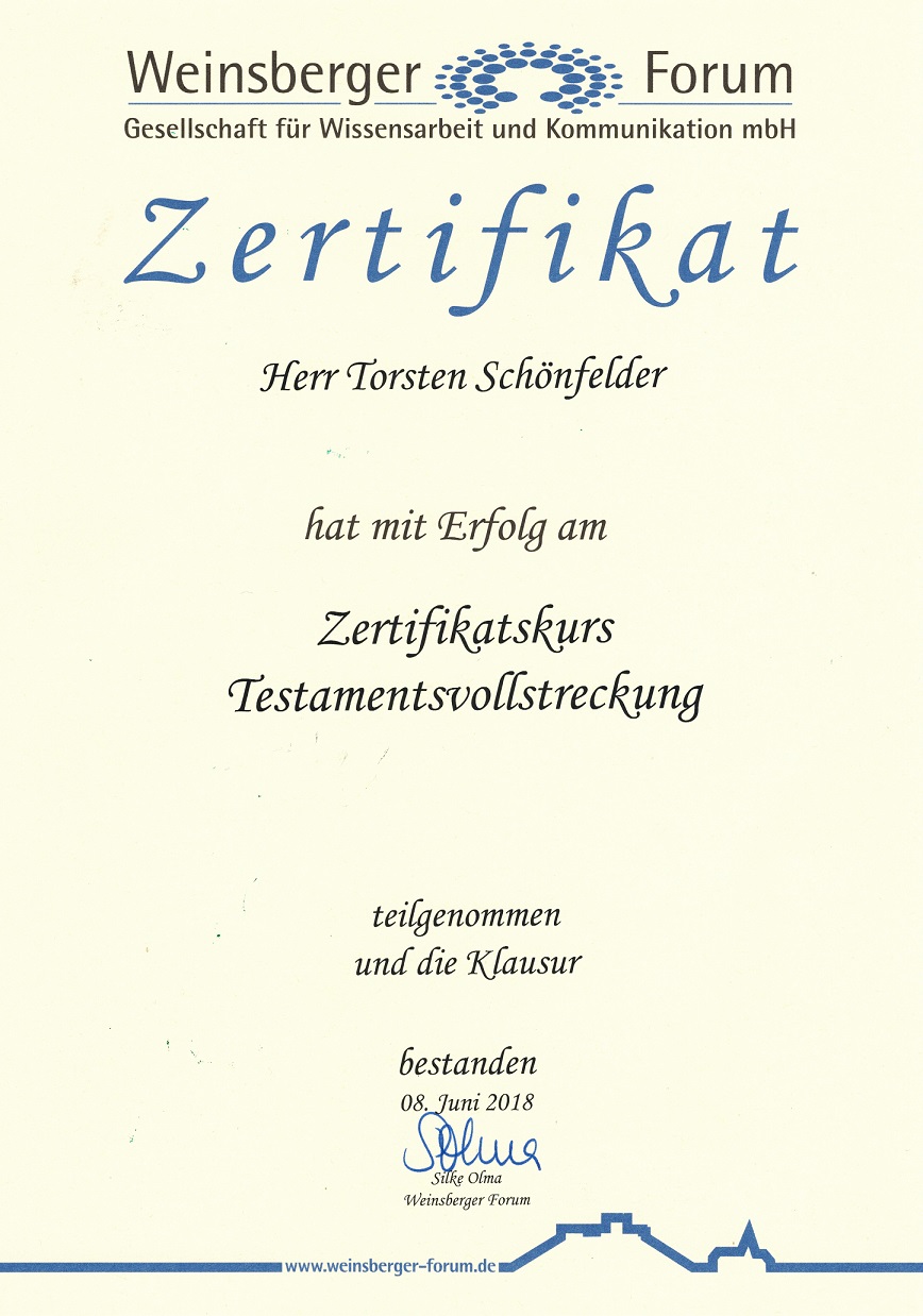 Wir beraten Sie gern! Herr Torsten Schönfelder hat 2018 beim Weinsberger Forum das Zertifikat zum Testamentsvollstrecker erlangt. Zu den Ausbildungsinhalten können Sie die Teilnahmebestätigung einsehen (PDF unten).
